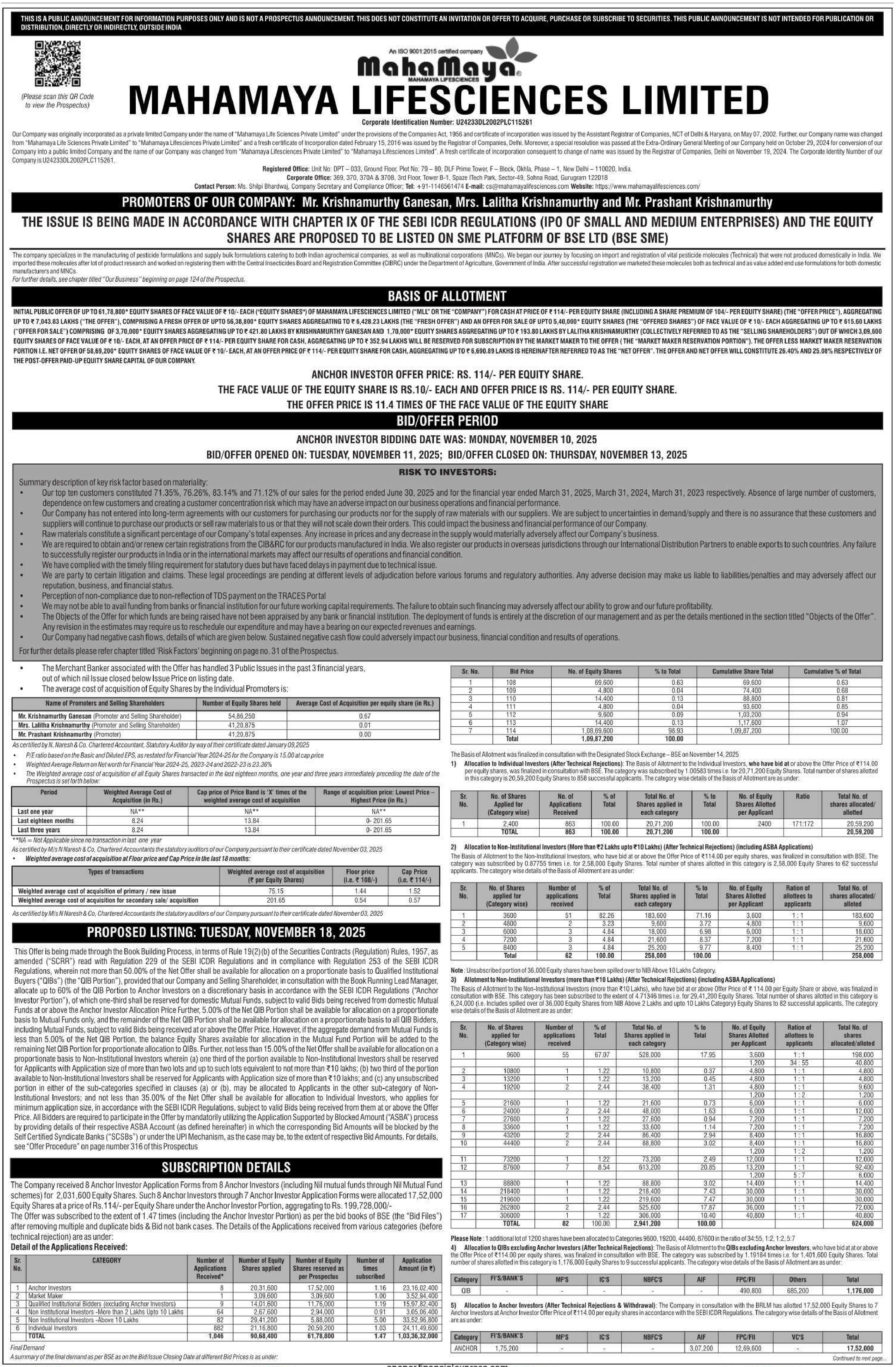 Mahamaya Lifesciences Listing Price